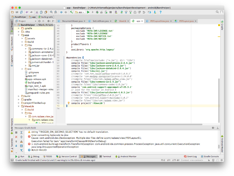 I've finished the first round of rewrites, but now I can't run the project because of this error "Multiple dex files define Lcome/radaee/view/PDFLayout$1."