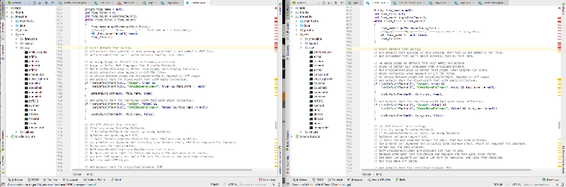 Regarding app customizations, these should also be the same between the two apps, and they involve adding some additional page turning controls in files like PDFLayoutView and PDFLayout. I don't think these customizations would affect the rendering of the fonts.