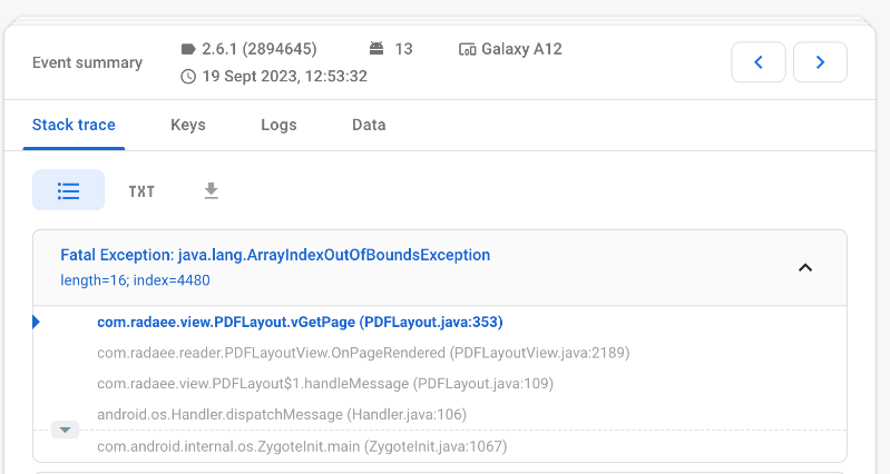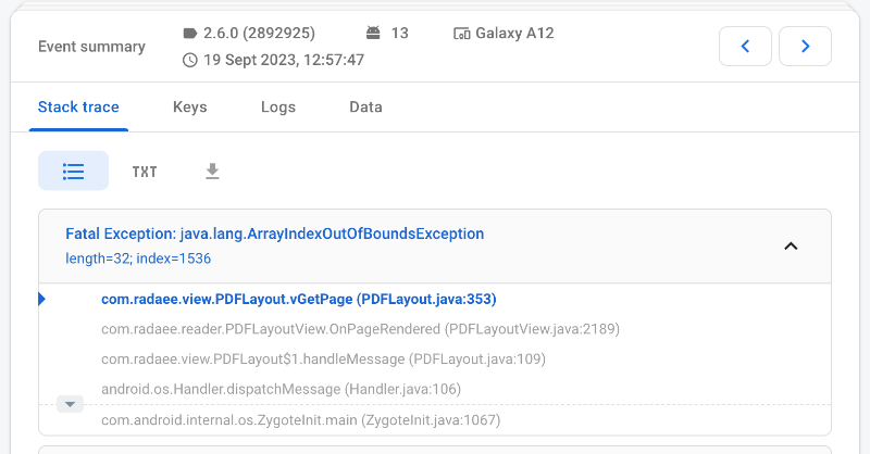 2. Crash issueIssue is reproduced in our app with fast scrolling between pages in PDF and can’t be reproduced in Radaee Sample, however assuming from crash log Issue is somewhere in radaee lib.