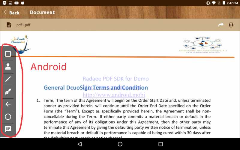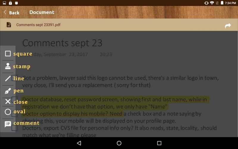Pen : when we click on it opens new tool menu with square, stamp, line,pen,close,comment,oval