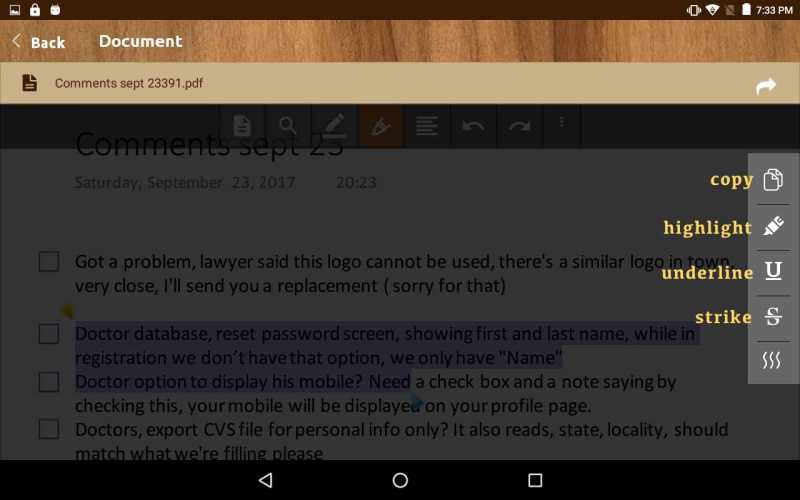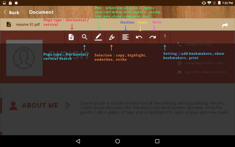 You can find search, ink, rect, ellipse, add bookmark, bookmark list, outline and print features on toolbar and highlight, underline, strike, copy and comment features on text selection (you can enable text selection with a long press).
