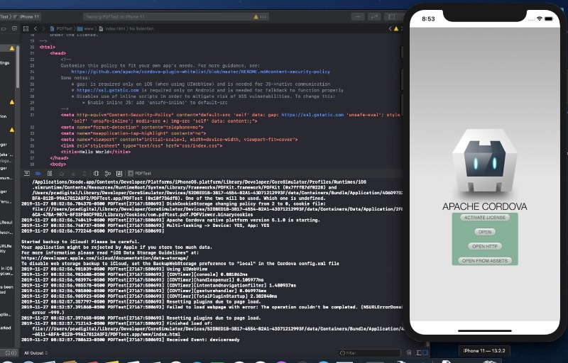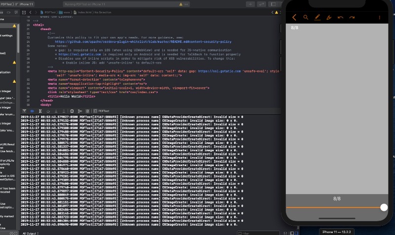 Works great on Android, but when I use on iOS (Catalina, XCode 11, latest Cordova), in BOTH my app and the demo app from git, the player loads a blank screen and the debug window fills up with: