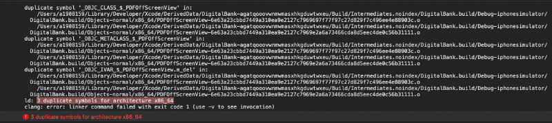 To solve it you should delete duplicate symbols: just remove reference or move to trash the PDFOffScreen class situated in Radaee/include/PDFViewer. Then you should have the same class not duplicated, situated in Radaee/include/PDFViewer/PDFView.