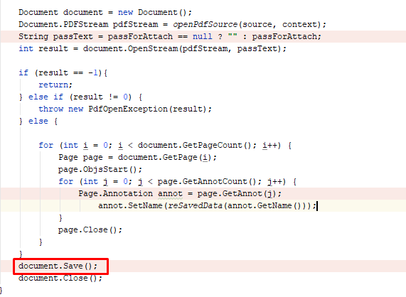 Hello Radaee. There was a problem after saving the document. If you compare the original document and the document after saving by content, then unknown data appears that interfere with further actions on EDS(Electronic Digital Signature), because the documents are not the same. The document changes even when I don't change (save) anything in the annotations - annot.SetName (data)); ), the changes happen after document.Save() fires. Is there anything you can do about this so that the document doesn't change after document.Save ()? Thanks.