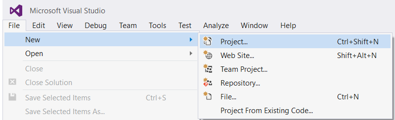 2. Launch Visual Studio and click on New Project: (Note: this was created using VS 2015)