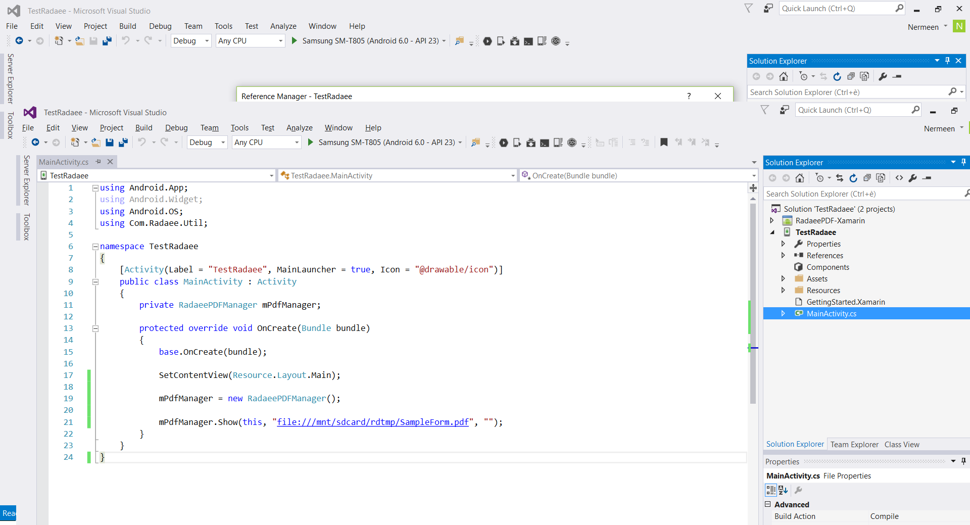10. Open TestRadaee->MainActivity.cs, and add the following code to open a pdf file:
