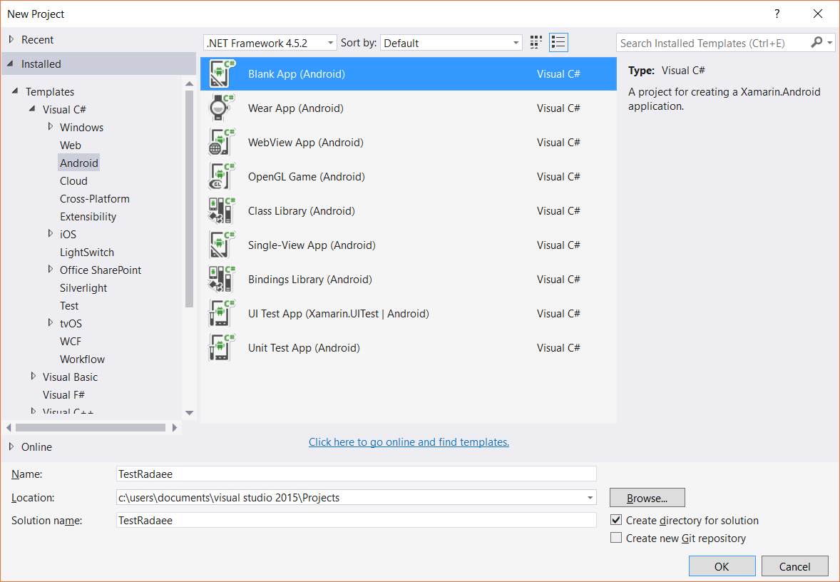 3. Create an Android project, select the Android then Blank App (Android). Enter a project name (TestRadaee):