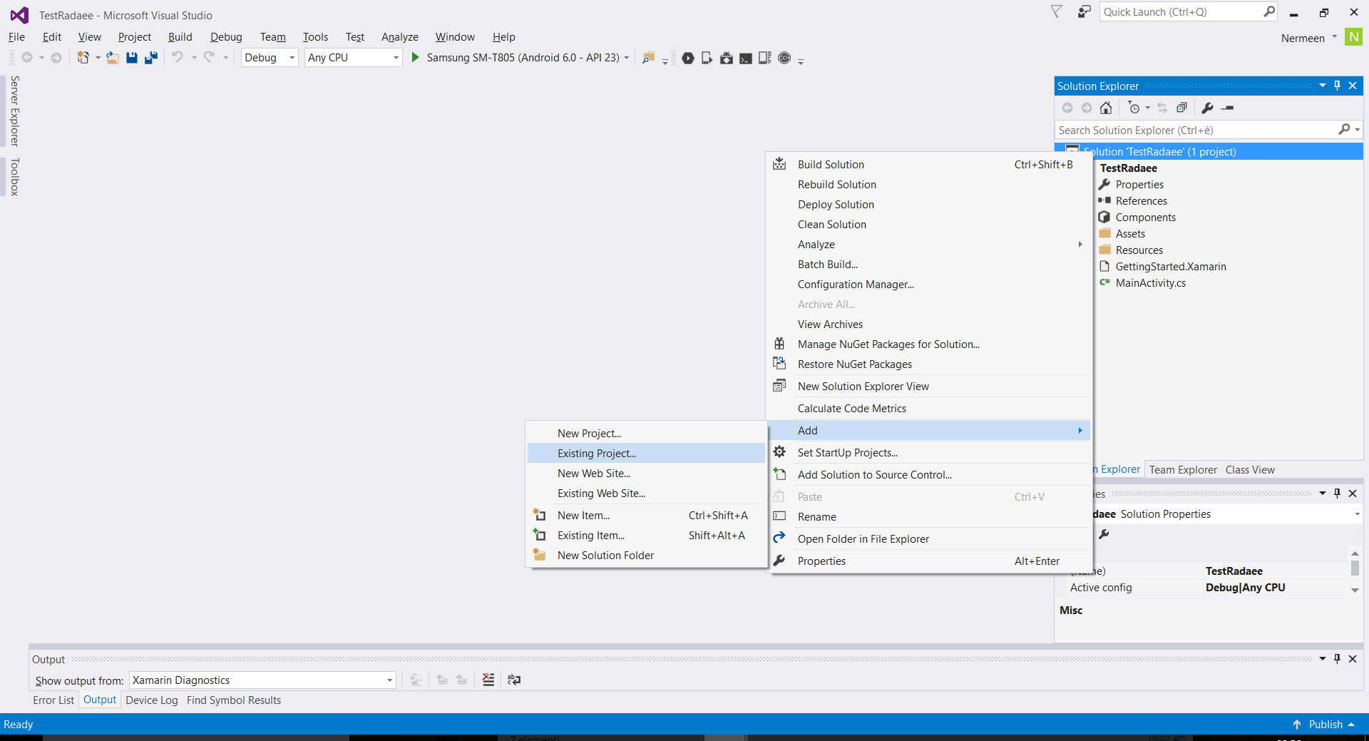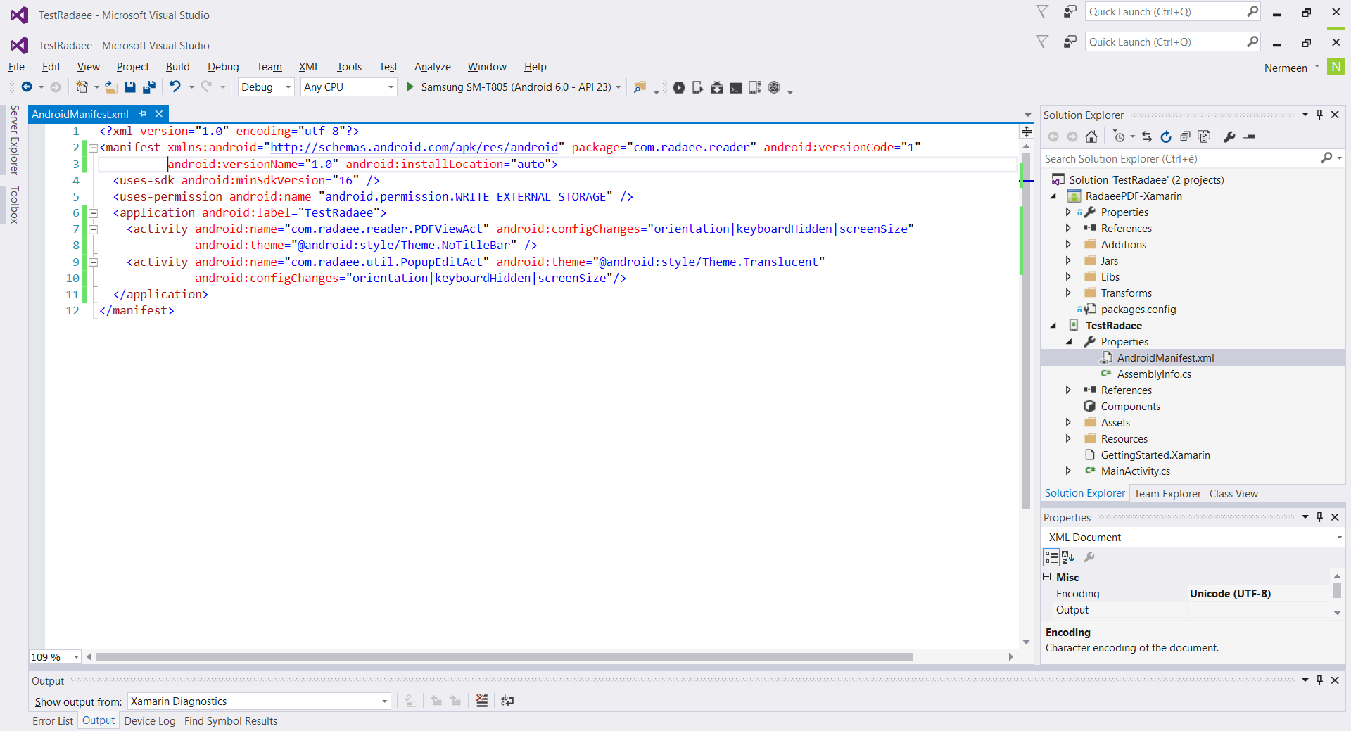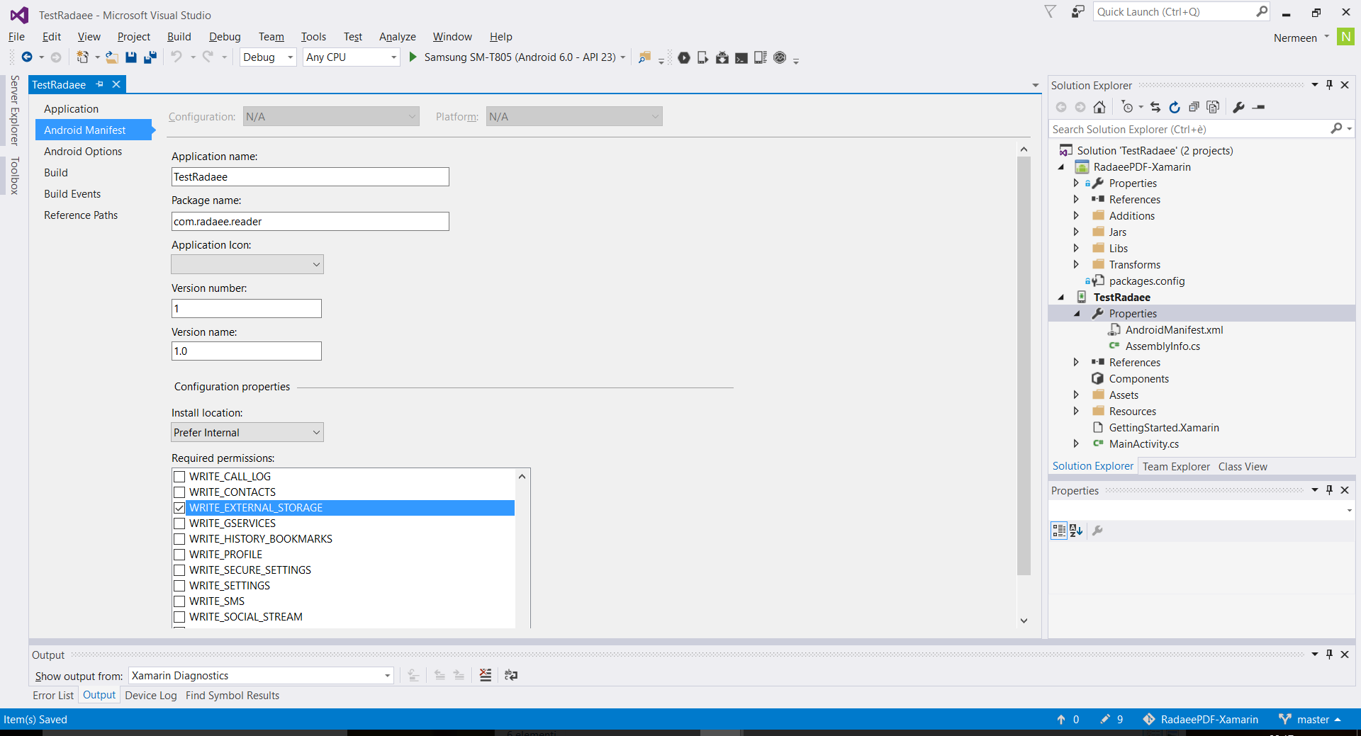 8. Open TestRadaee's Properties->Android Manifest, and add WRITE_EXTERNAL_STORAGE (if needed) and set the correct Package name.