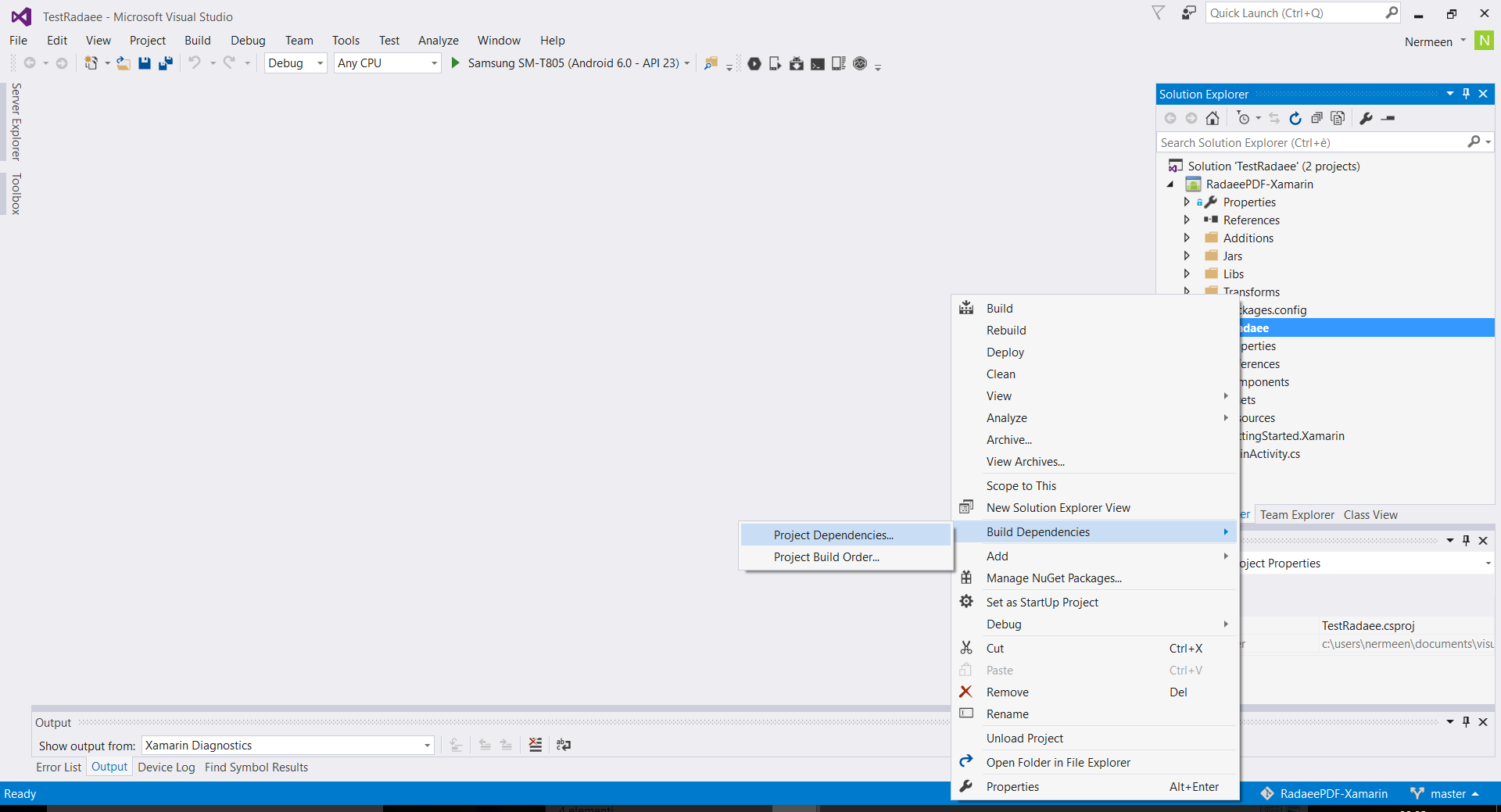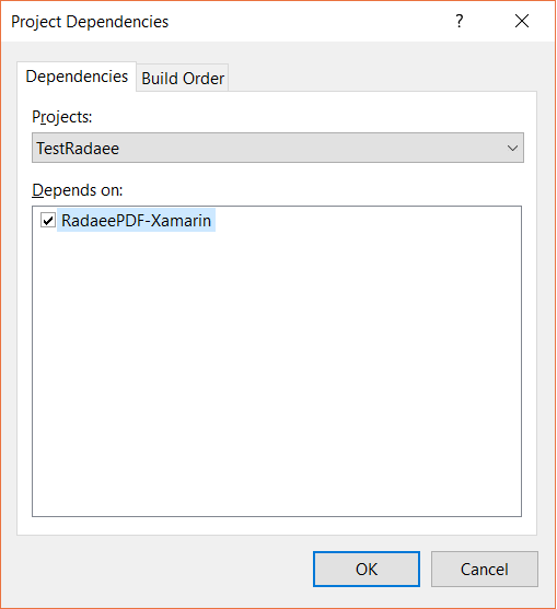 5. Now add the project dependency, right click on TestRadaee->Build Dependencies->Project Dependencies: