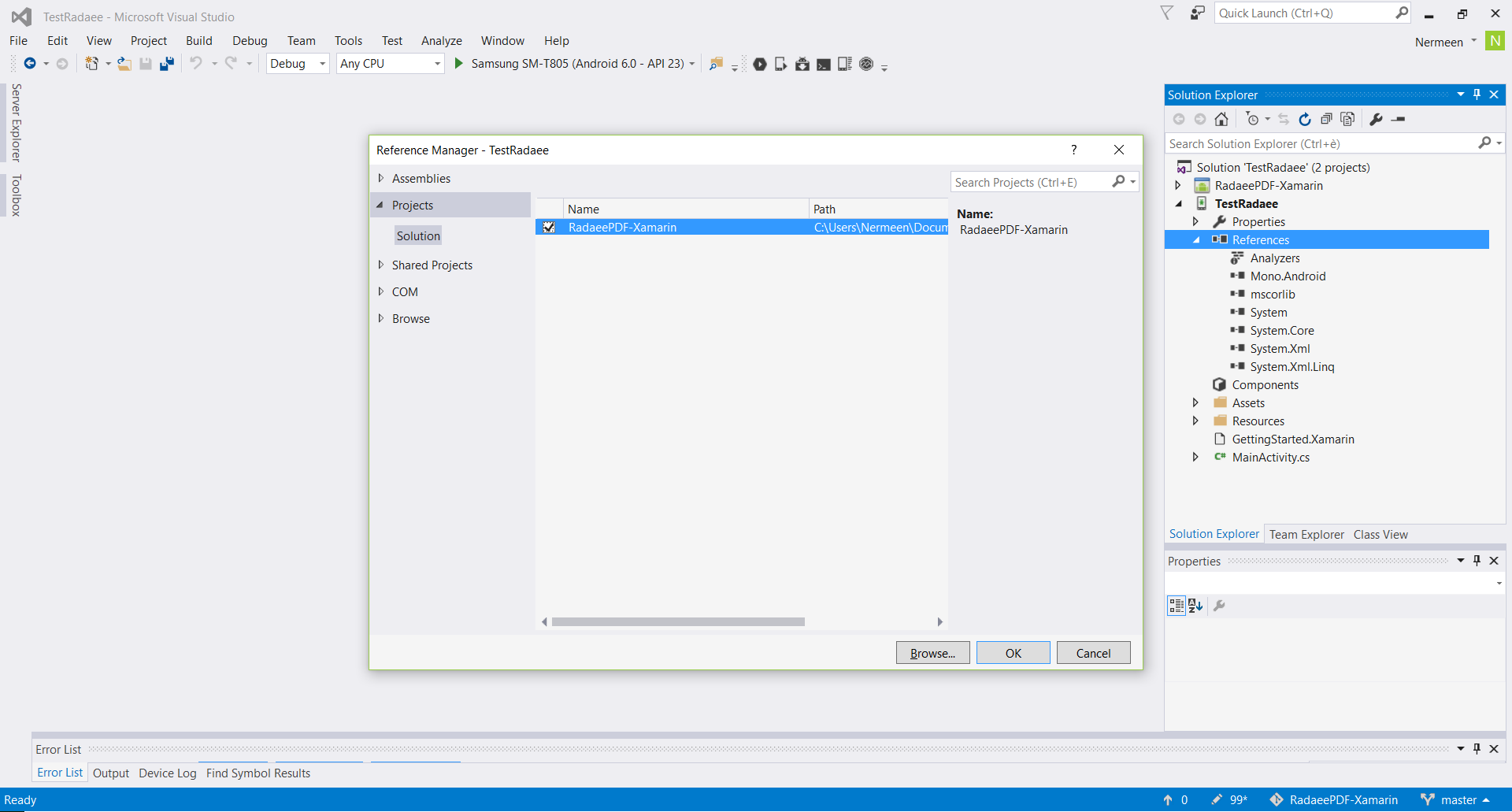 7. Add the project reference, TestRadaee->References->Add Reference...-> and select RadaeePDF-Xamarin:
