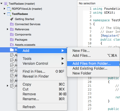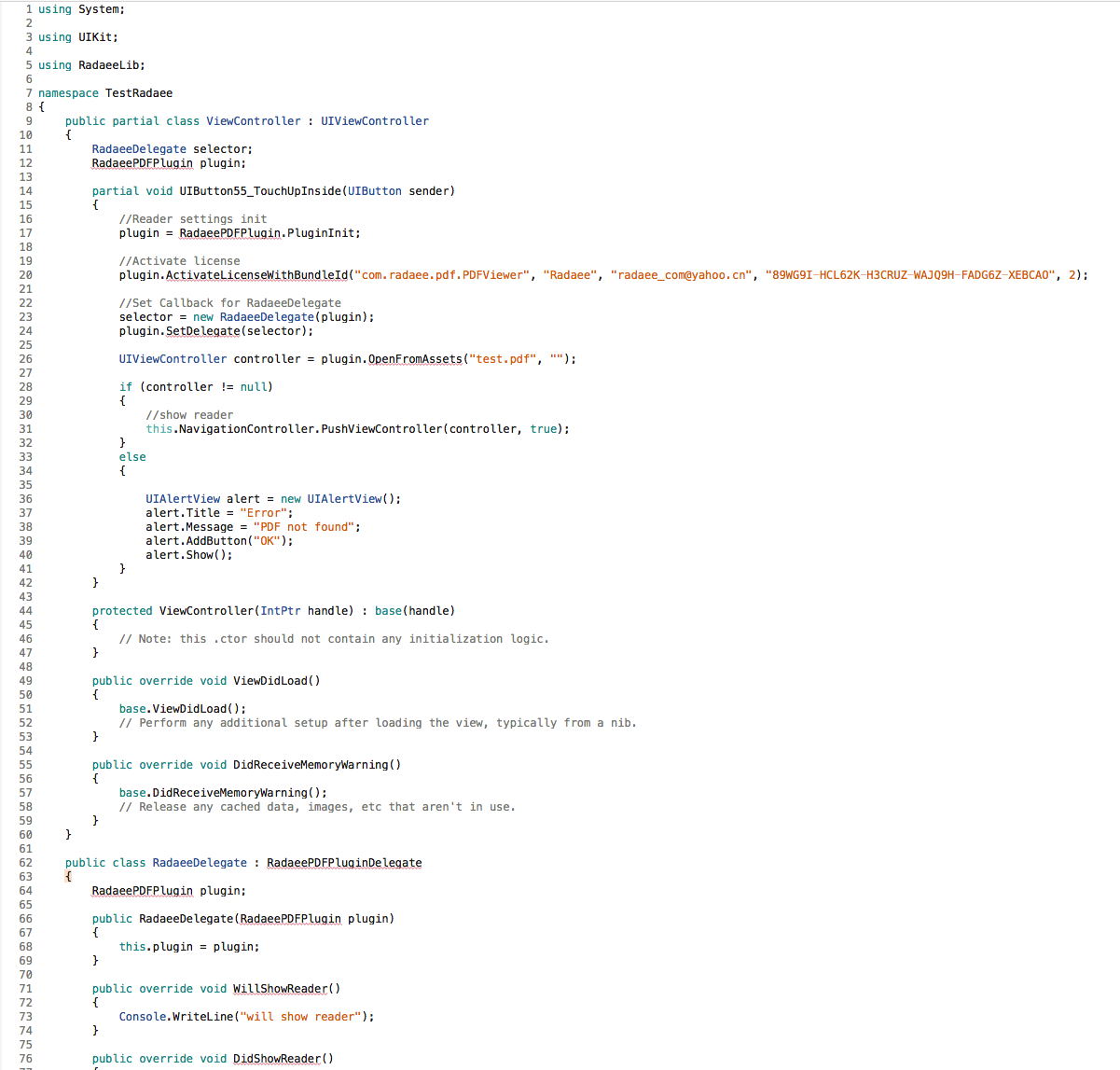 14. Open TestRadaee->ViewController.cs and edit the button action with the following code to open a pdf file: