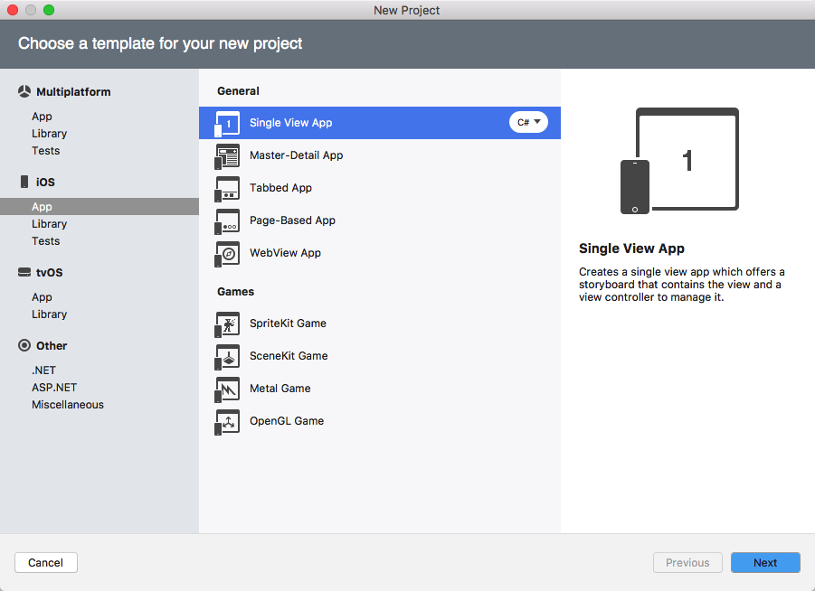 3. Create an iOS App, select App then Single View App (iOS). Enter a project name (TestRadaee):
